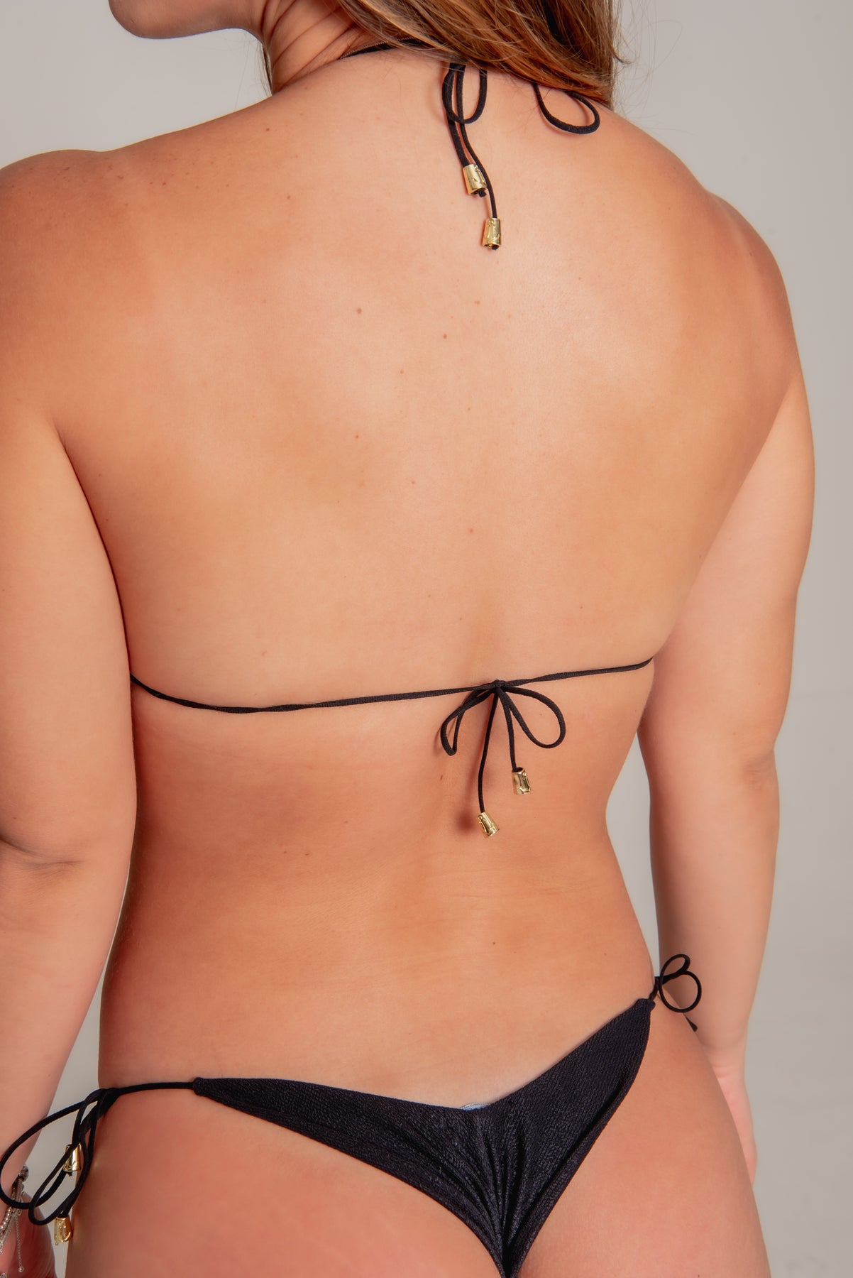 Calcinha fio dupla com amarração também nas alcinhas fininhas, toda forrada e com detalhe da taxinha para compor o look com o top.
