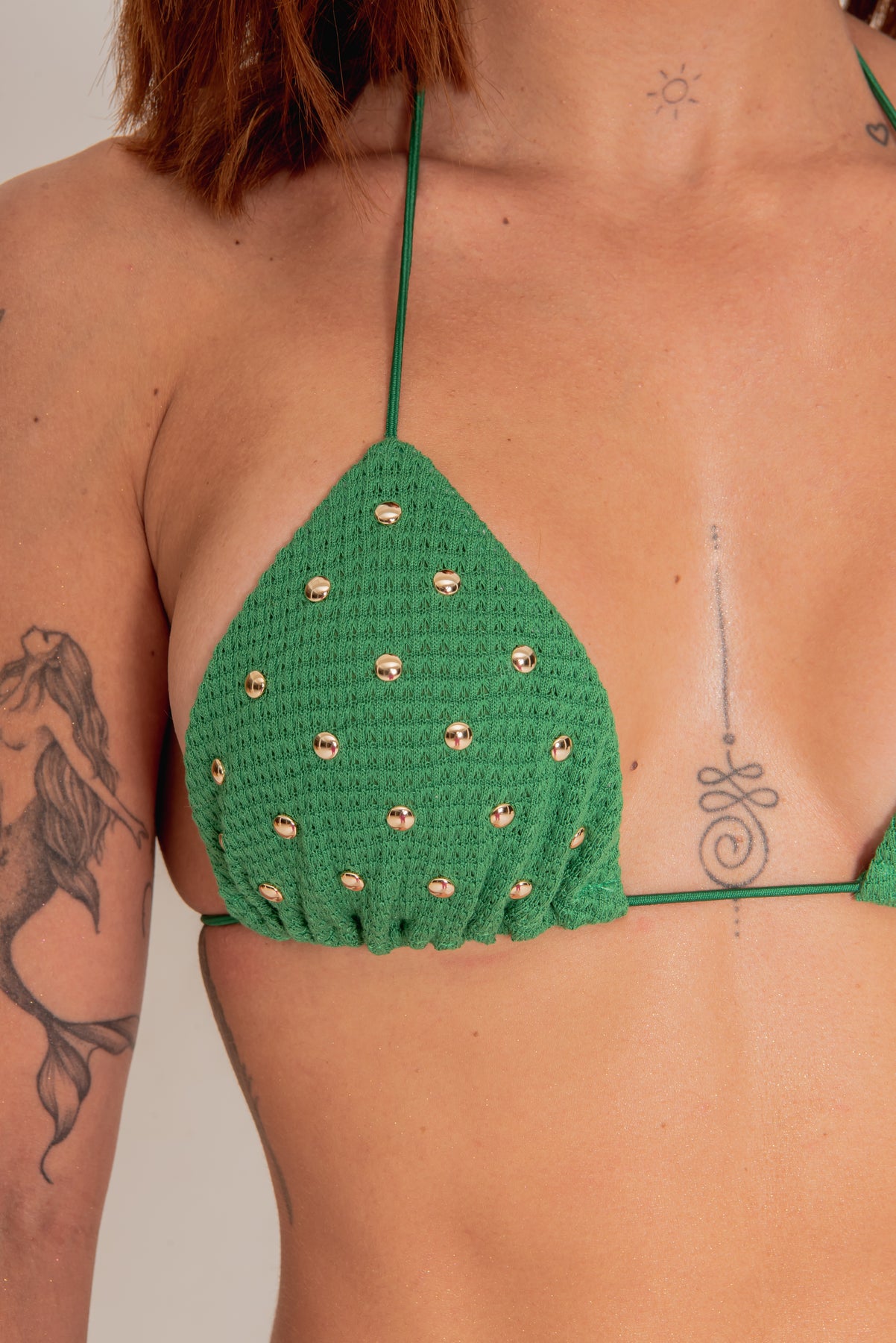 BIQUINI MARCELA: Top Cortininha Com Detalhe De Taxinhas douradas, um biquini com detalhes artesanais e único, na modelagem do cortininha tradicional porém trazendo as alcinhas fininhas no rabo de rato perfeito para os dias de sol sem deixar aquela marquinha da alça do biquini.