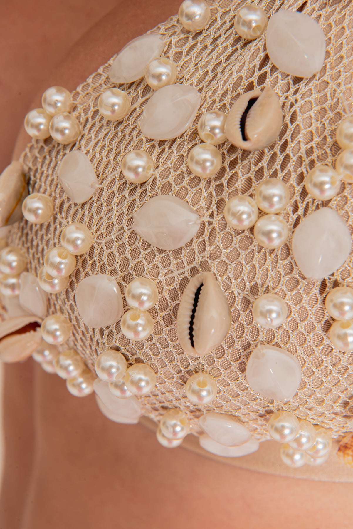 Top bordado todo feito a mão com perolas, búzios e conchas, composto por um tecido de telinha em sobreposição de um tecido brilhoso trazendo ainda mais glamour pra peça.